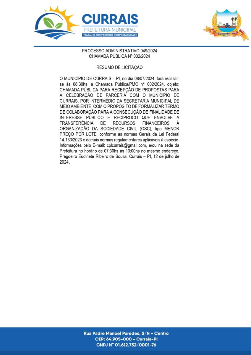 AVISO DE CHAMADA PÚBLICA Nº 002/2024