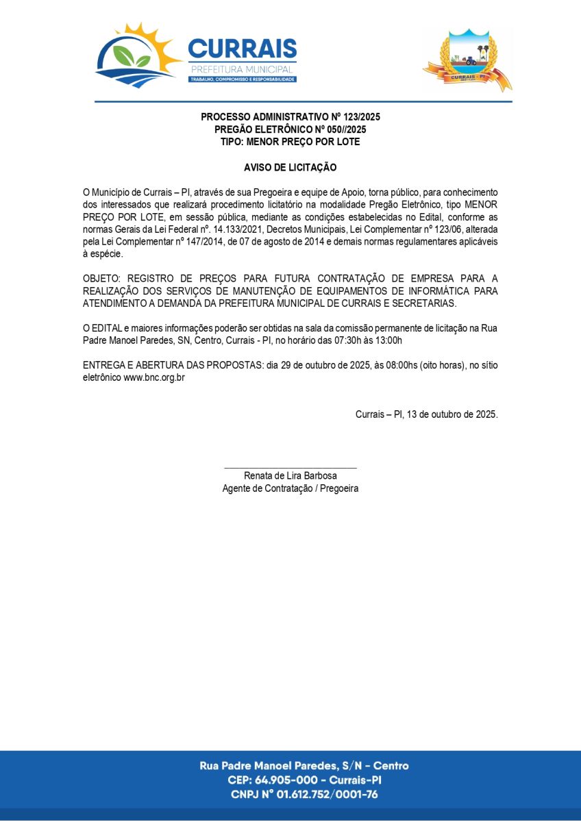 AVISO DE PREGÃO ELETRÔNICO Nº 050/2025