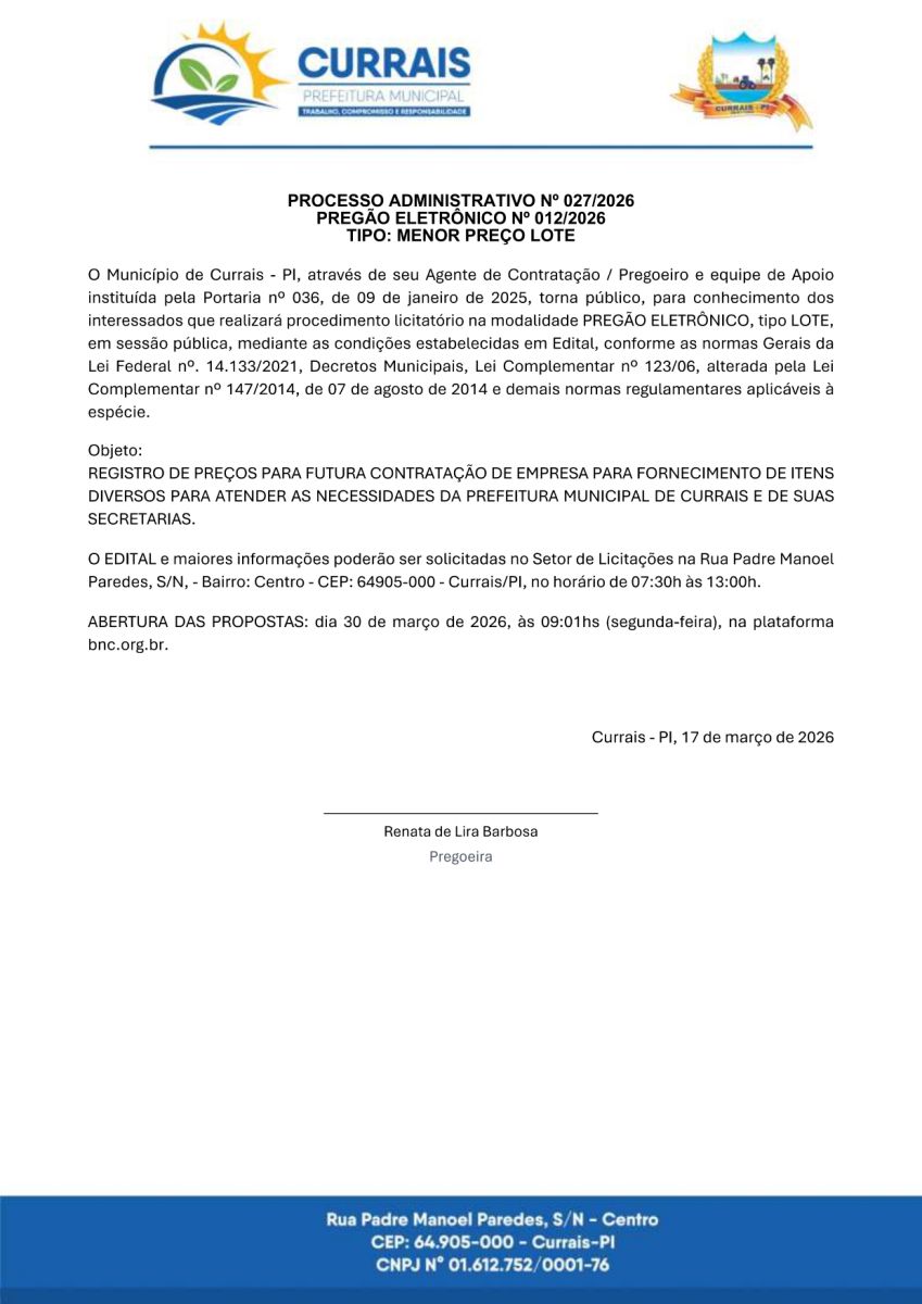 AVISO DE PREGÃO ELETRÔNICO N° 012/2026